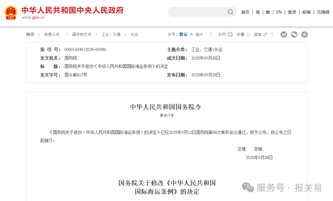 2025年9月28日,国务院总理李强签署第817号国务院令,公布《国务院关于修改〈中华人民共和国国际海运条例〉的决定》,自公布之日起正式施行。这是该条例自2001年颁布以来的第五次修订,也是在国际海运面临复杂多变国际形势和数字化转型背景下的重要调整。