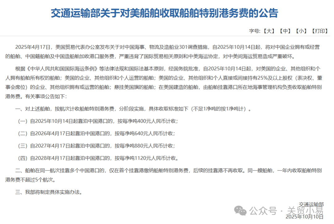 10月10日,交通运输部发布关于对美船舶收取船舶特别港务费的公告。