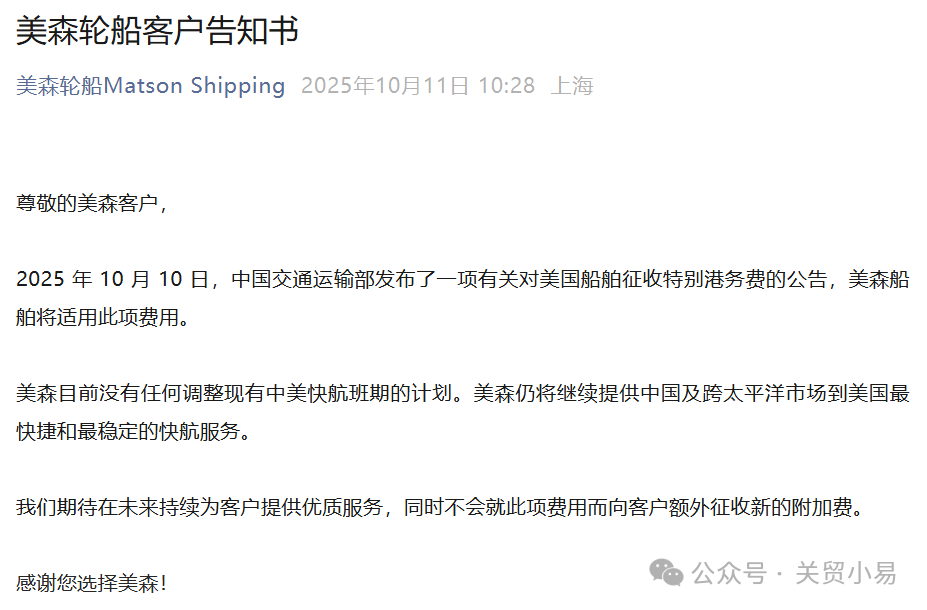 日前,中国交通运输部发布了一项有关对美国船舶征收特别港务费的公告,美森轮船表示,美森的船舶将适用此项费用。