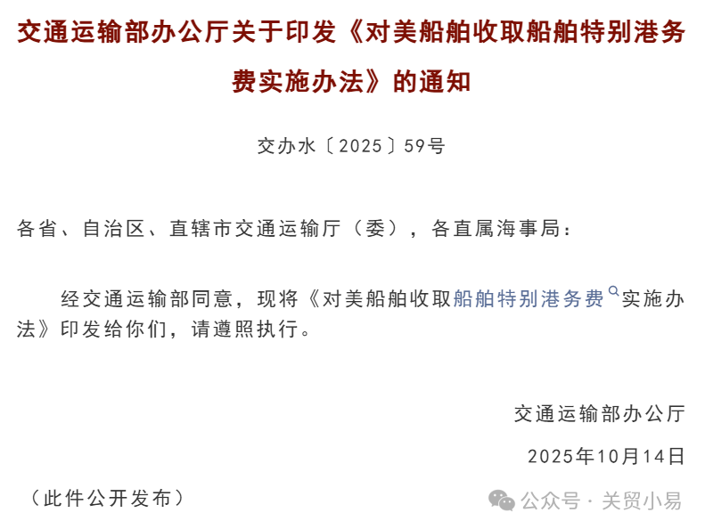 10月14日凌晨,交通运输部办公厅发布关于印发《对美船舶收取船舶特别港务费实施办法》(以下简称“办法”)的通知。