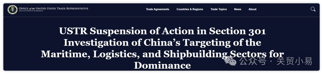 当地时间11月9日,美国贸易代表办公室(USTR)网站发布公告,宣布暂停针对中国海事、物流及造船业的301调查相关措施。