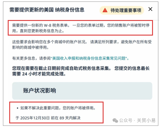 近日,大批亚马逊美国站卖家收到站内信,提示其在2025年12月30日前完成W-8税务表单的更新,否则将面临账户停用、商品下架甚至永久封号的严重后果。