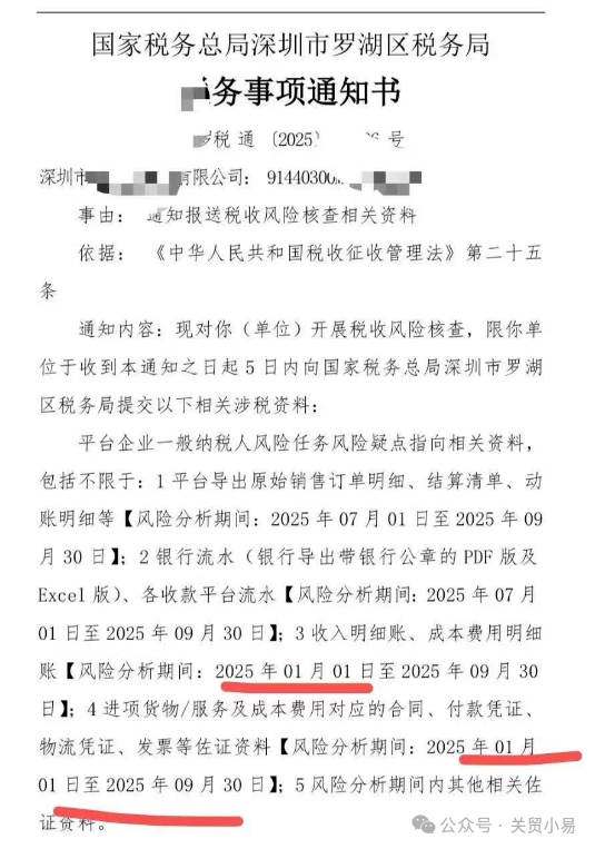 部分卖家收到了两次预警短信后,又收到了来自税局的“税务事项通知书”,要求配合税收风险核查,5日内提交一堆明细资料: