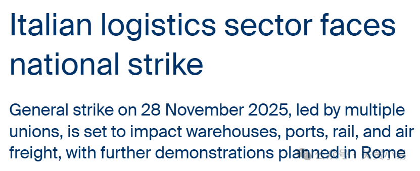 意大利交通部表示罢工将影响整个货运行业,涵盖仓库、配送等,预计将对供应链、交付和港口运营产生影响。