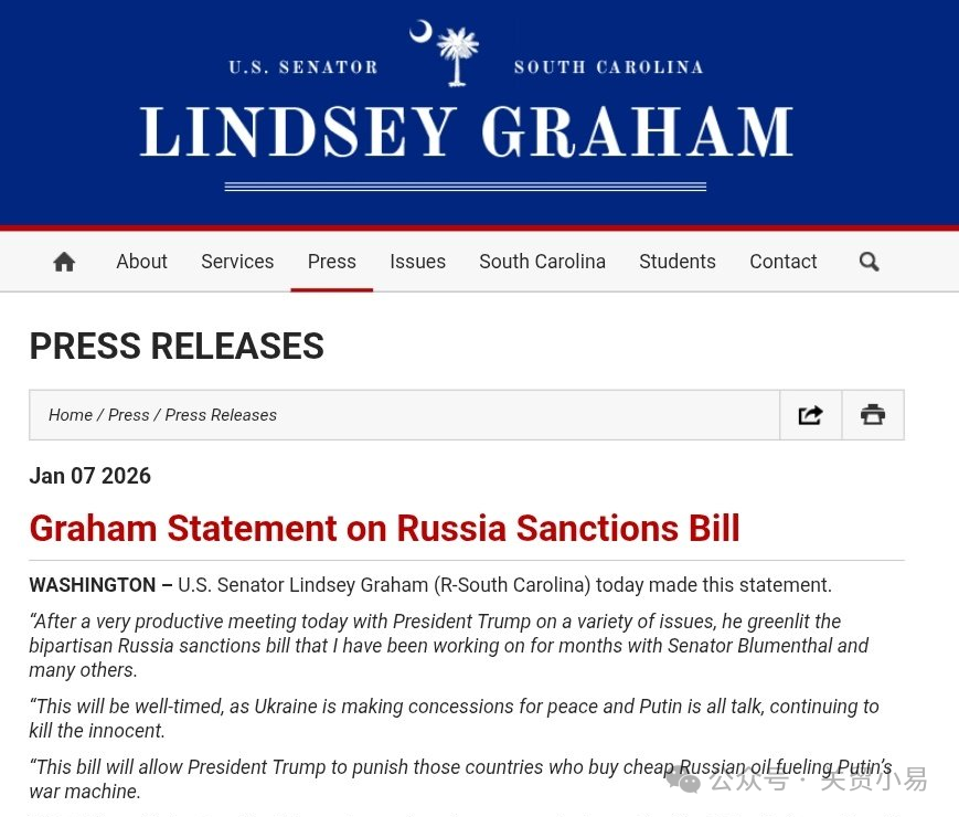 美国当地时间2026年1月7日,美国参议员林赛·格雷厄姆宣布,美国总统特朗普已批准一项两党支持的俄罗斯制裁法案——《2025年制裁俄罗斯法案》。