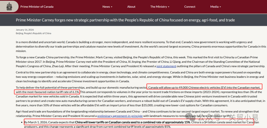 上周,中国和加拿大就电动汽车和油菜籽达成的贸易协议。根据协议,加方将给予中国电动汽车每年4.9万辆的配额,配额内享受6.1%的最惠国关税待遇,不再征收100%附加税,配额数量将按一定比例逐年增长。
