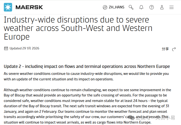 近期,恶劣天气对全球供应链的冲击不断加剧。过去一周,欧洲从北欧至西南欧地区,持续的冰雪天气与极低气温,给港口作业和海上航行带来了严重影响。