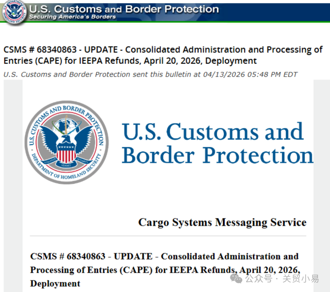 当地时间4月10日,美国海关和边境保护局(CBP)发布公告,确认此前依据《国际紧急经济权力法》(IEEPA)征收的特定关税,将于4月20日正式部署自动化退款处理系统(CAPE)。