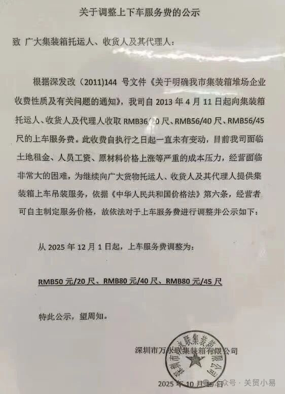 近日,深圳多家港口外堆场(含深圳市万水联集装箱有限公司、深圳市兴思达集装箱有限公司等)发布公告,宣布自2025年12月1日起,调整“上下车服务费”(即“外堆场约柜费”),此前该费用自2013年4月11日起未变动。