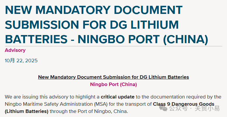 10月22日,海洋网联船务(ONE)发布关于《关于锂电池危险品——宁波港实施强制性文件提交新规》的通知公告,自发布之日起生效。
