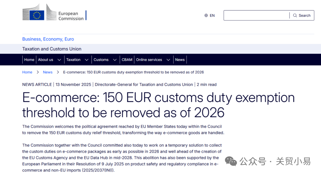 欧盟原计划2028年3月取消价值低于150欧元小额包裹的关税豁免,但欧盟推动提前至2026年实施,较原计划提前2年实施。