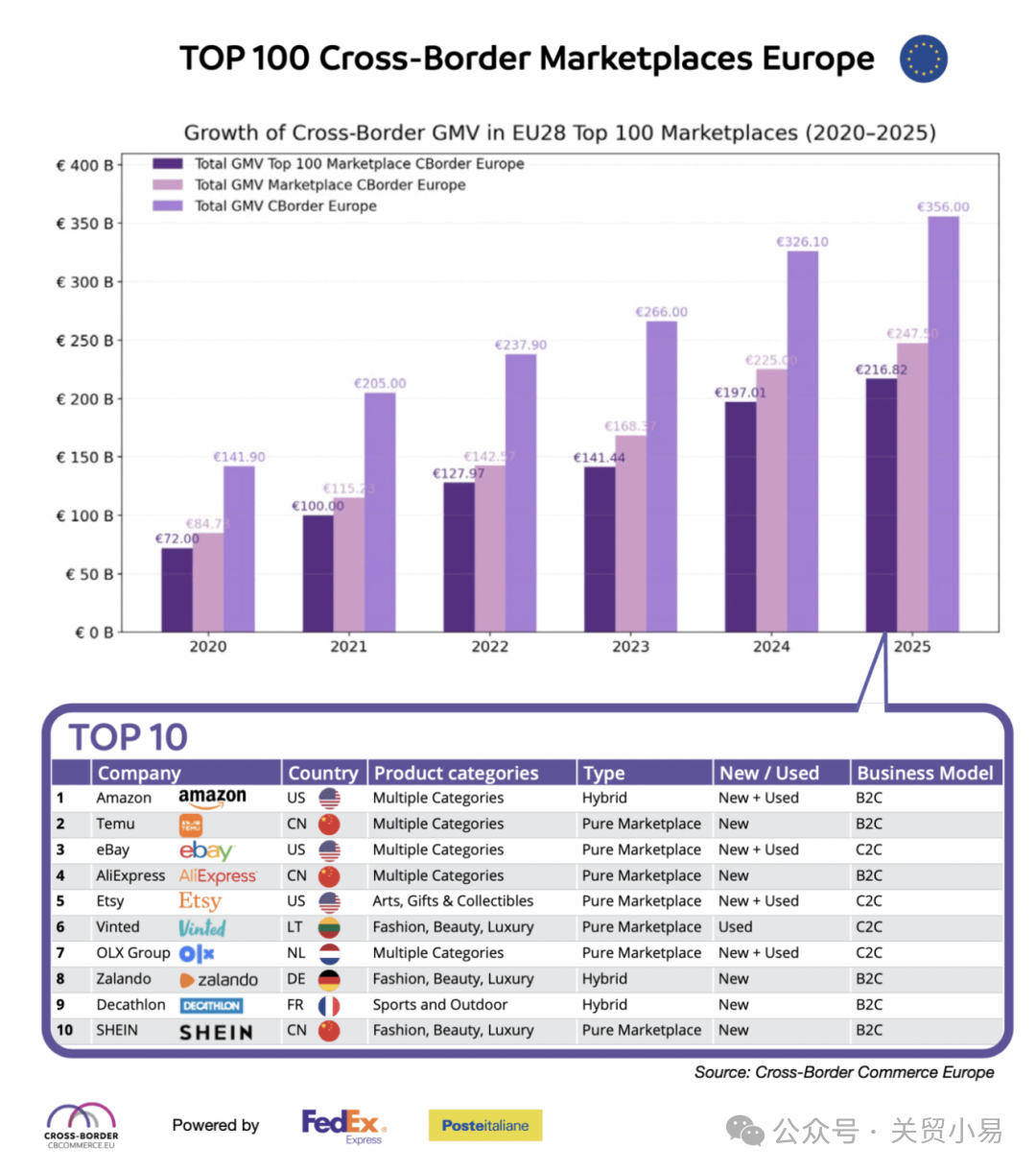 《欧洲跨境电商百强平台报告(第六版)》数据显示,2024至2025财年间,欧洲跨境电商总交易额达3587亿欧元。